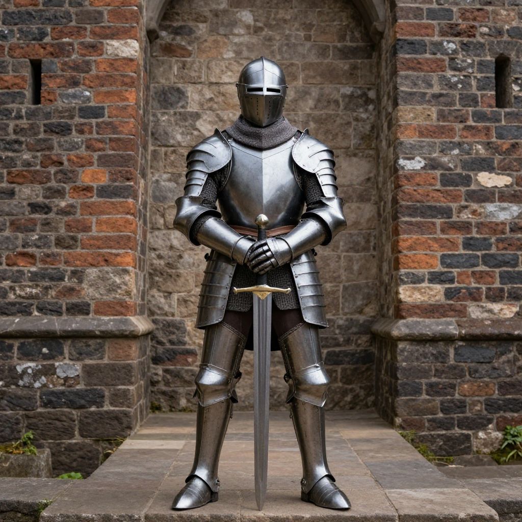 Photograph of a medieval knight in full, polished, silver armor standing in front of a stone archway. The knight, with a helmet obscuring their face, holds a long, straight sword with both hands across the hilt. The armor is detailed with overlapping plates, and the knight stands on a stone path. The background features a mix of red, brown, and gray bricks, with some moss growing at the base. The knight's stance is upright and formal, emphasizing the rigid, protective nature of the armor. The overall scene evokes a sense of historical, medieval Europe.