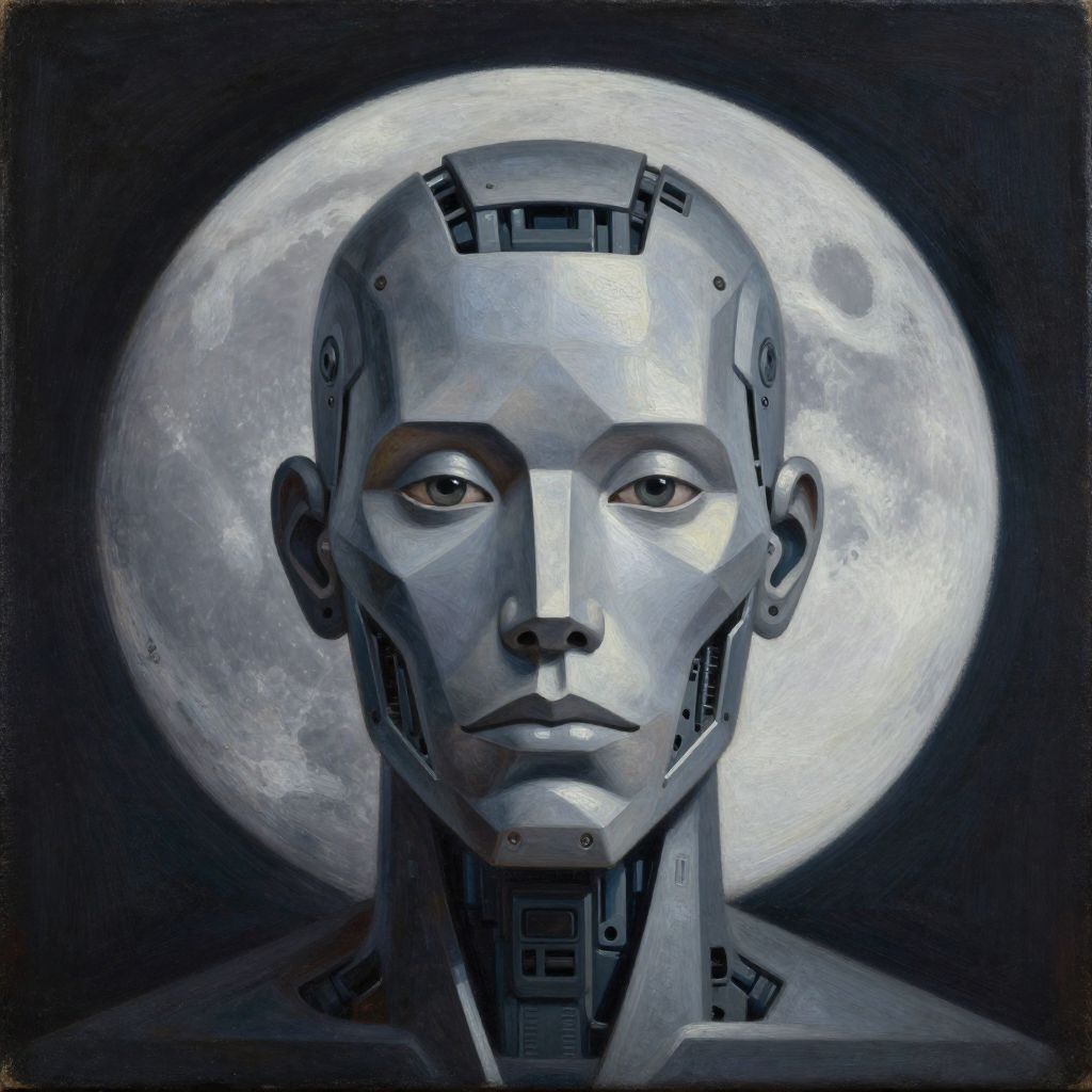 Digital painting of a robotic human face with metallic textures, calm expression, and detailed mechanical features, centered against a glowing full moon in a dark background.