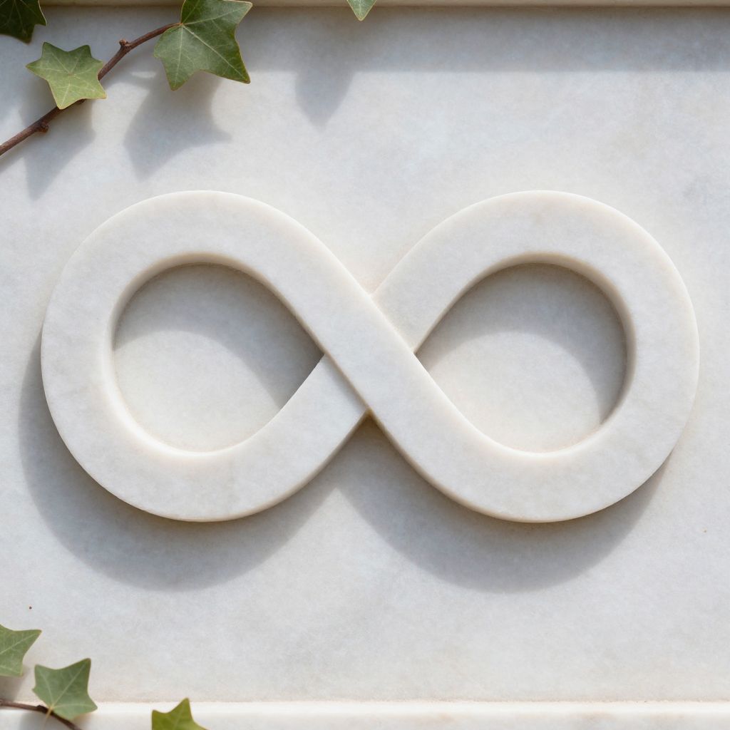 Close-up of a white infinity symbol carved in polished marble, surrounded by delicate ivy leaves, natural light casting soft shadows, elegant and timeless aesthetic, high detail texture capturing the stone grain