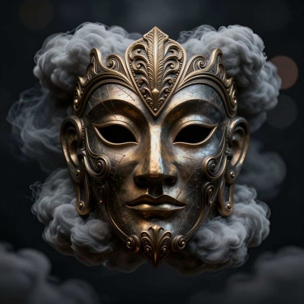 An elaborate intricate mask surrounded by storm clouds, rendered in octane, behance hd, bokeh backdrop 8 k, 3 d rendering by wlop, greg rutkowski, artstation, artgerm, 8 k, unreal engine, classical painting, matte painting, masterpiece, bokeh background, darksynth, dark background, greg rutkowski artwork, ultra detailed, hyper realistic, bokeh depth