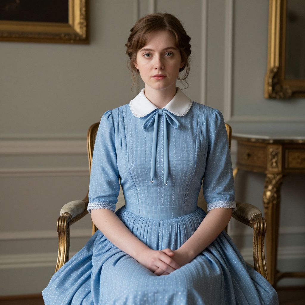 Queen Anne Collar Dress, woman in a blue dress and tiable sitting in a room