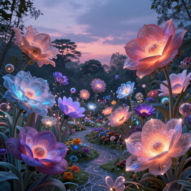 Digital artwork depicting a twilight garden scene with luminescent flowers. Large, glowing flowers in shades of pink, blue, and purple with intricate, translucent petals illuminate the pathway winding through the garden. Smaller glowing orbs and soft purple and blue lights add to the ethereal ambiance. The background shows silhouetted trees against a pink and purple twilight sky. The flowers and lights create a magical, otherworldly atmosphere, with a mix of soft, cool, and warm hues blending harmoniously. The pathway curves gently, adorned with colorful flowers and small lights.