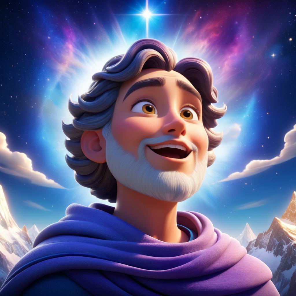 A Pixar-style 3D rendering of a joyful, awe-inspiring male deity with a long, flowing blue beard and mustache, looking upwards with a blissful expression. The celestial background features a glowing halo, bright star, distant mountains, and a vibrant twilight sky filled with stars and nebulae.