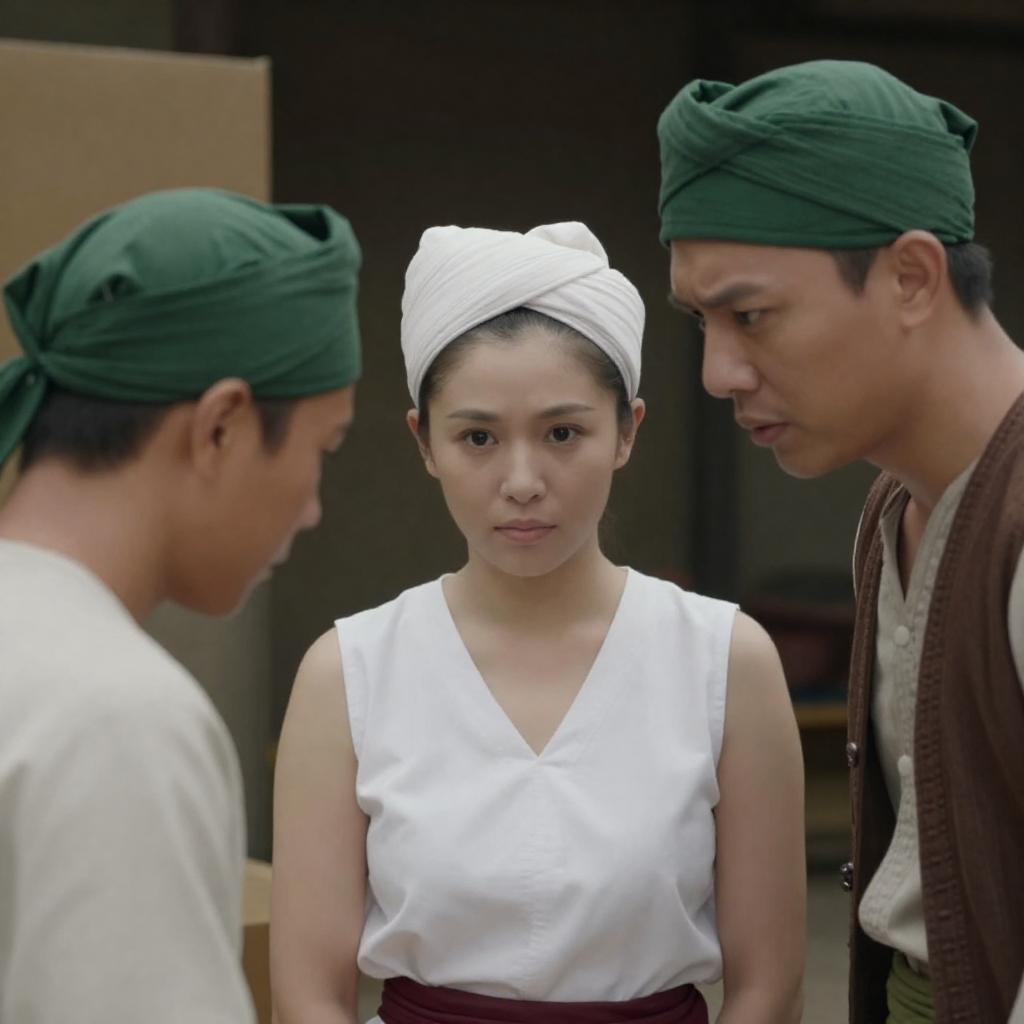 Photograph of three East Asian individuals. Center woman with white sleeveless blouse and white headwrap, right man in green headwrap and brown vest, left man in green headwrap. All lean forward, focused on something off-frame. Background includes a box. Right man has a concerned expression. Center woman's expression is neutral. Left man's back is to the camera. Dimly lit, indoor setting.