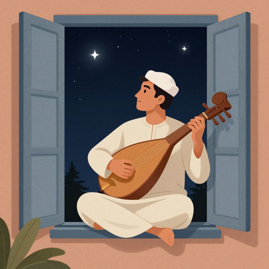 Digital illustration of a man in white traditional attire, playing a tan oud, sitting on a windowsill at night, with blue shutters open. Stars