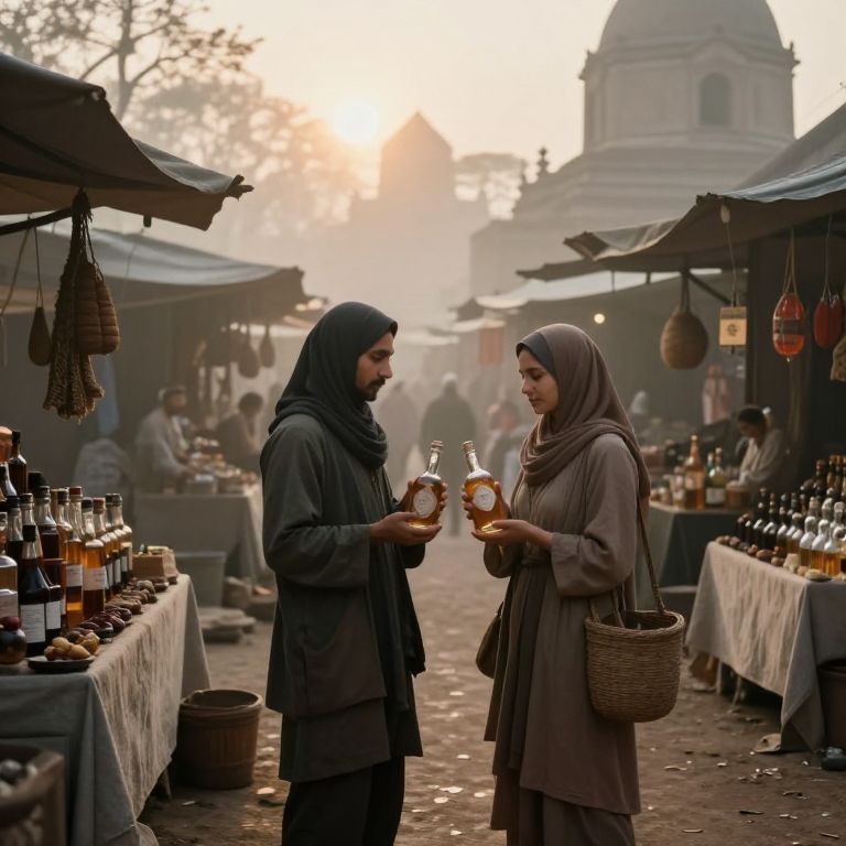 In the hazy embrace of dawn, two figures stand amidst a labyrinth of ancient market stalls, their hands cradling bottles that hold not just liquid, but the whispers of memory and the promise of tomorrow—trading bottled dreams for bottled time, their silent negotiations echoing the timeless dance between hope and transience.