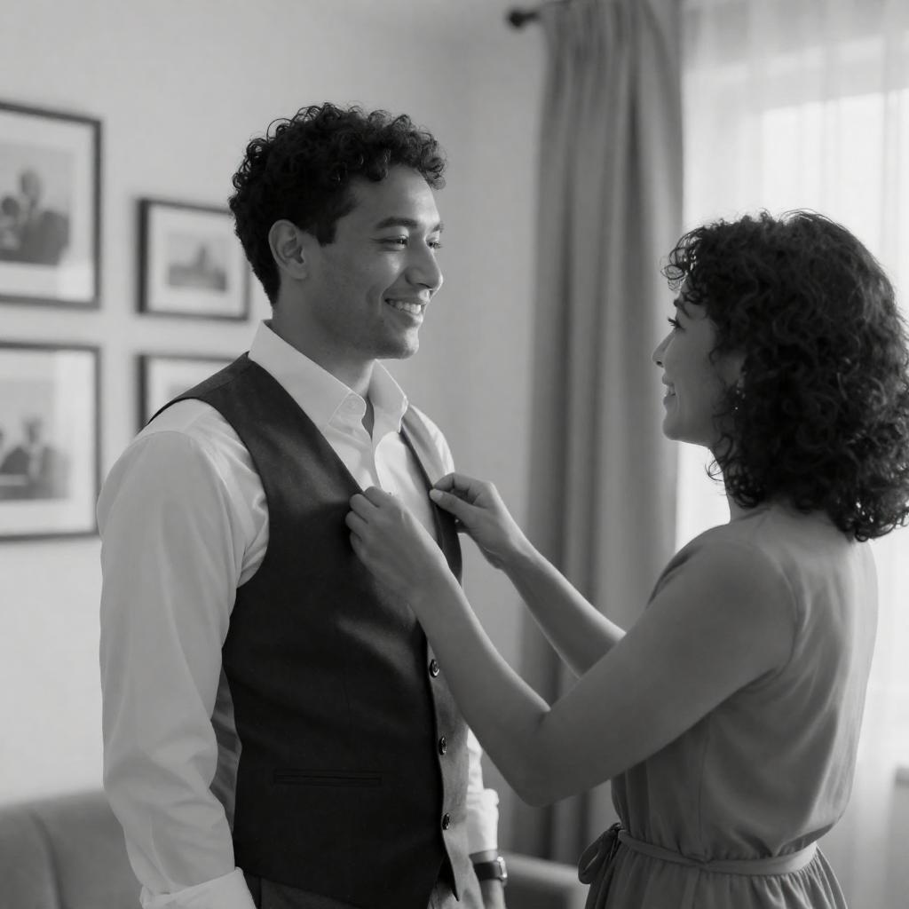 Sepia-toned photograph of four people. Center: man in dark suit, white shirt, holding a glass, smiling. Right: nude woman, arm raised, touching man's face. Left: child in white dress, holding a doll, sitting on a couch. Back: man in white robe, standing, watching. Background: wooden paneling, chair with circular object. Man and nude woman are mid-interaction, child is on couch, man in robe observes.