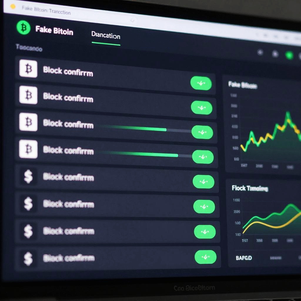 Fake bitcoin transaction screenshot designed with a complex fake blockchain explorer interface showing fabricated block confirmations, animated transaction flow, green success indicators, and stylish dashboard layout with crypto market trends, all rendered in sleek, high-tech futuristic style.