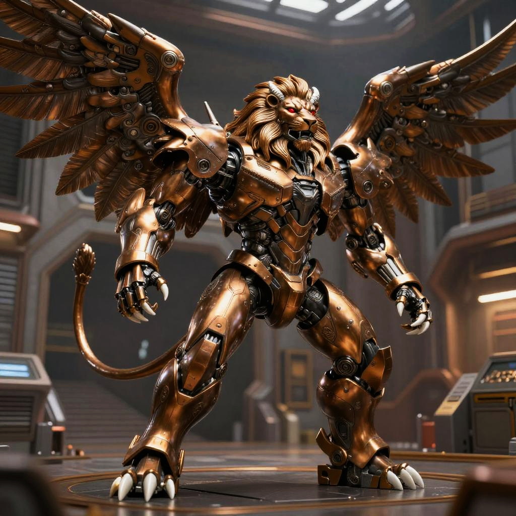 Anthro bronze lion mech, ((lineart)), membranous wings, horns, tail, red eyes, white claws, muscular solo, standing, fighting stance, huge mecha presence, no humans, science fiction, oversized futuristic hangar, dramatic low side angle, pwide shot, warm industrial lighting, 8k wallpaper, RAW photo, best quality, masterpiece, realistic, photo-realistic, mecha (mjstyle), (robot:1.5), (porcelain materials:1.6), (polished metal:1.4)