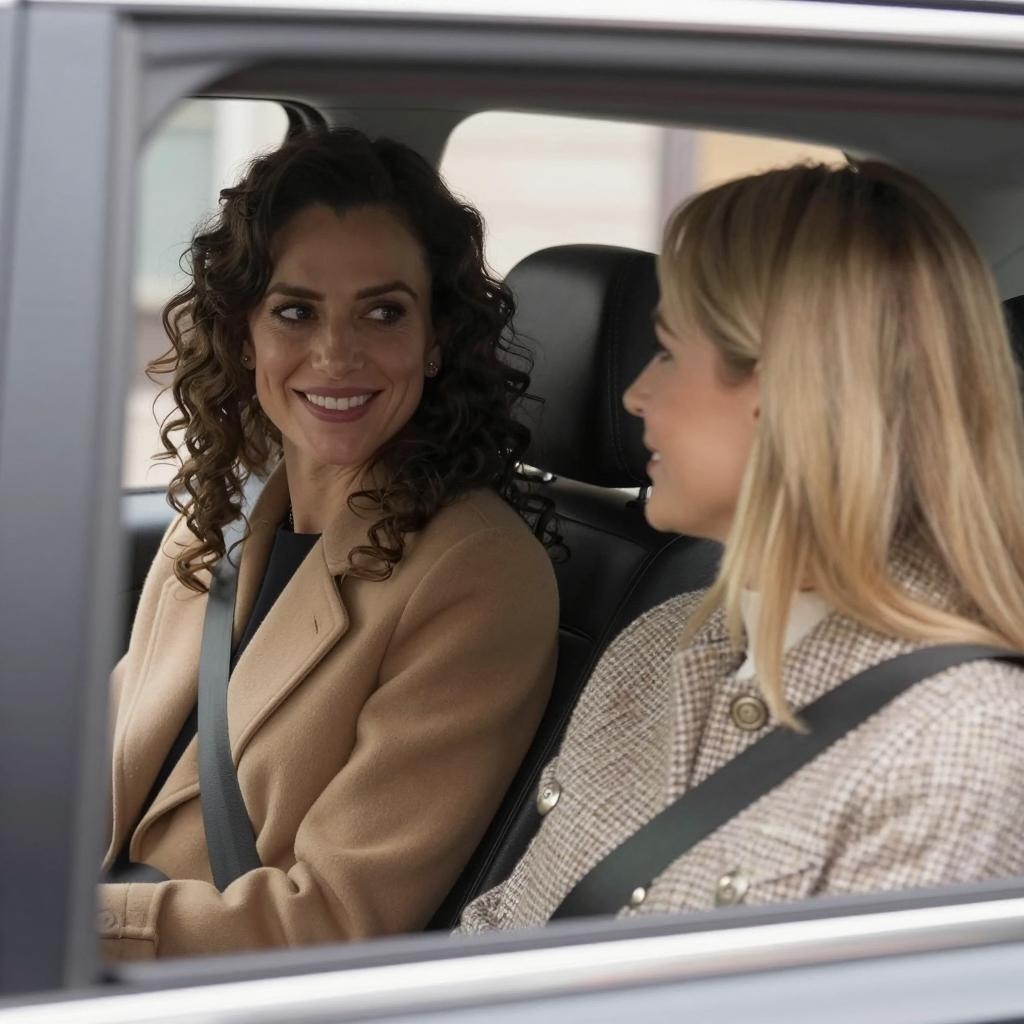 A man and woman in a car. Man with light brown hair, wearing a gray tweed suit, black and orange striped tie, and a flower crown, sits on the left. Woman with dark brown hair, wearing a light blue button-up shirt, holds the steering wheel on the right. They both smile at each other. Background shows blurred people and car interior.