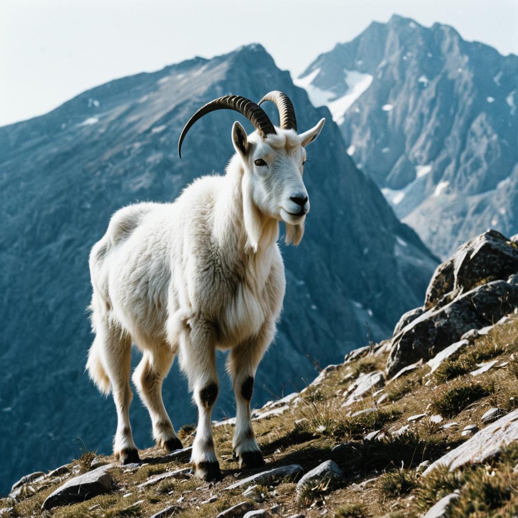 Detailed close-up portrait of a Eurasian lynx with tufted ears and spotted fur standing on a mountain background. The image captures the wildcat's intense gaze and distinctive facial features with natural light highlighting its fur texture.