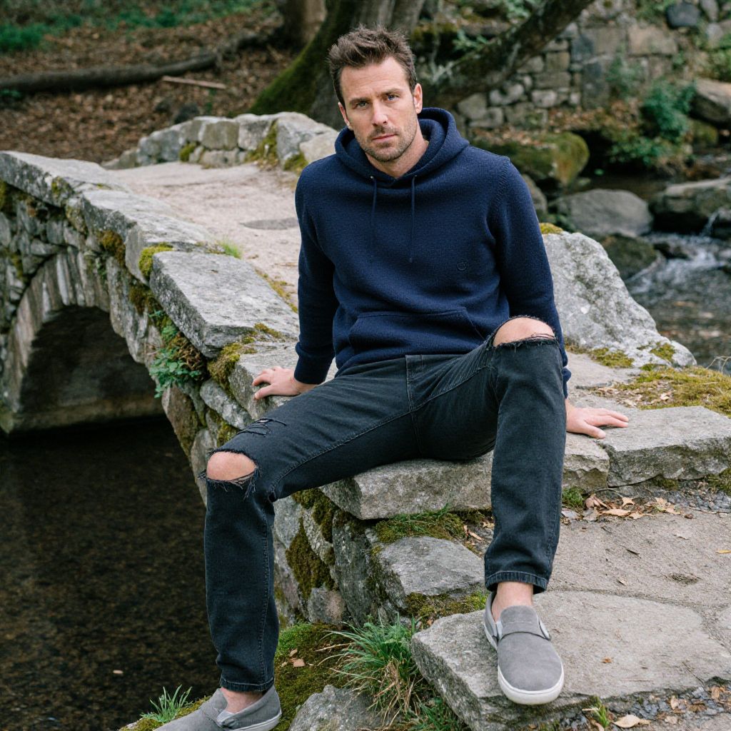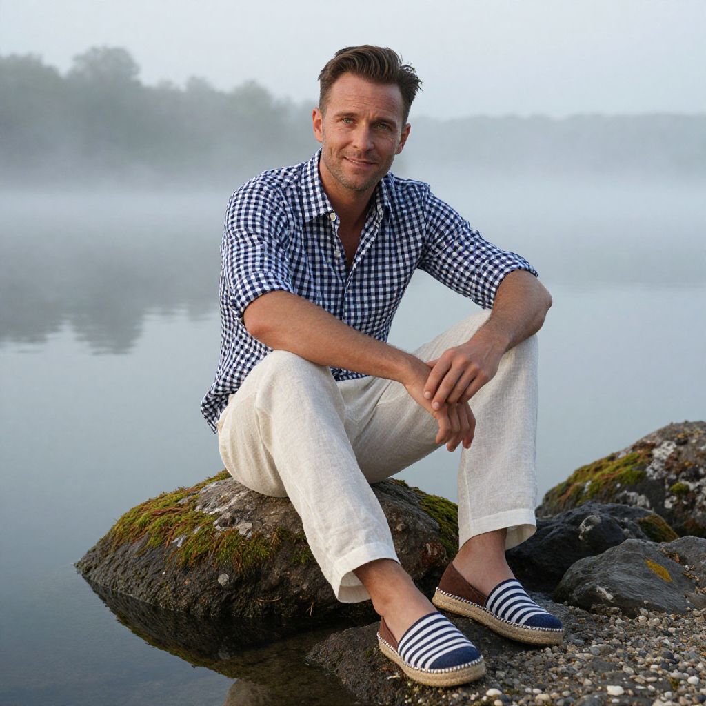 A man, charcoal hemp polo, khaki organic cotton cargo pants, dark brown suede loafers, understated silver bracelet, rustic wooden cabins, vibrant flower gardens, soft natural light, relaxed smile, casual confidence Man has masculine face and piercing eyes