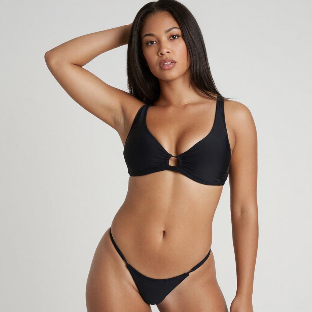 Photograph of a confident woman with medium brown skin and straight black hair, wearing a black bikini with a keyhole design. She has full lips, dark eyes, and is posing with one arm raised, hand resting on her head. The bikini top accentuates her medium-sized breasts, and the thong bottom reveals her toned abdomen and hips. The background is plain white.