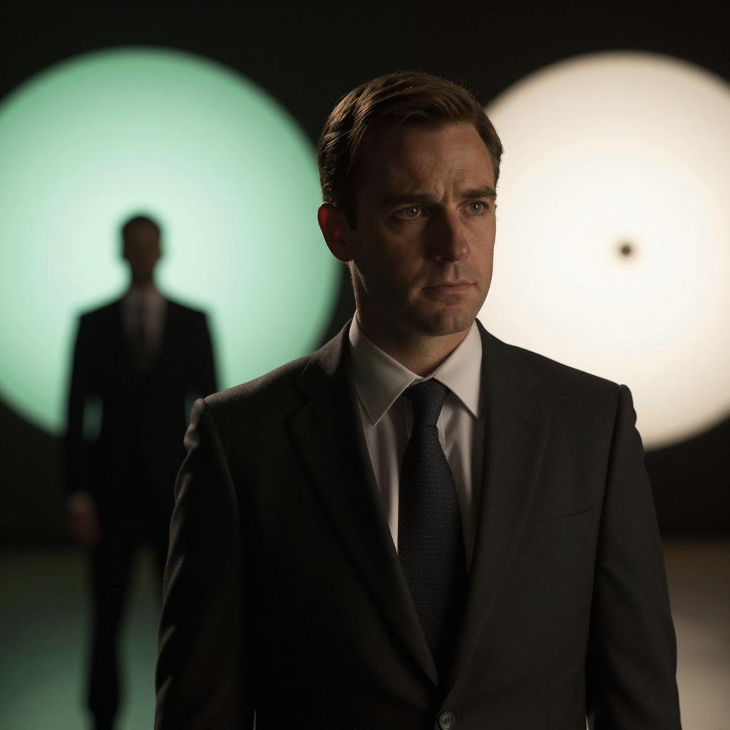 Black and white photograph of a man with short, dark, neatly combed hair, wearing a dark suit, white shirt, and striped tie. He has a serious expression, looking slightly to the right. Background includes blurred rooftops and chimneys.