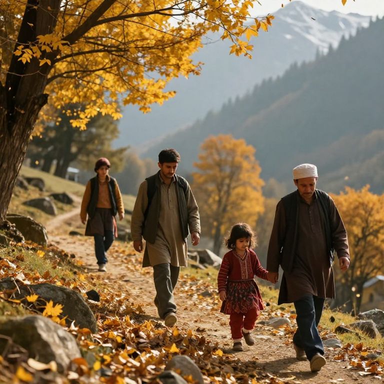 Kashmir, a local family hiking in the autumn hills, golden leaves falling, traditional attire, mountain background, warm forest light, emotional and authentic moment, natural photography style, cinematic composition.