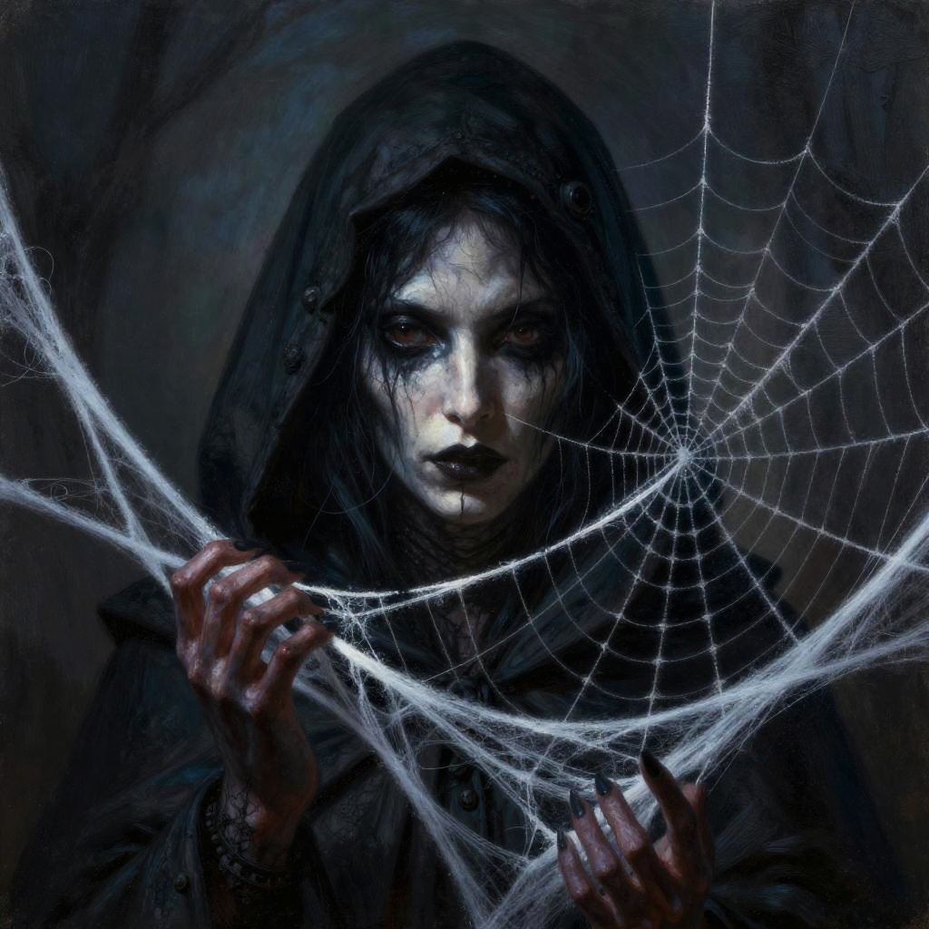 Digital artwork of a grim, pale-faced figure with dark hood, holding a glowing spiderweb, eerie blue and black tones.