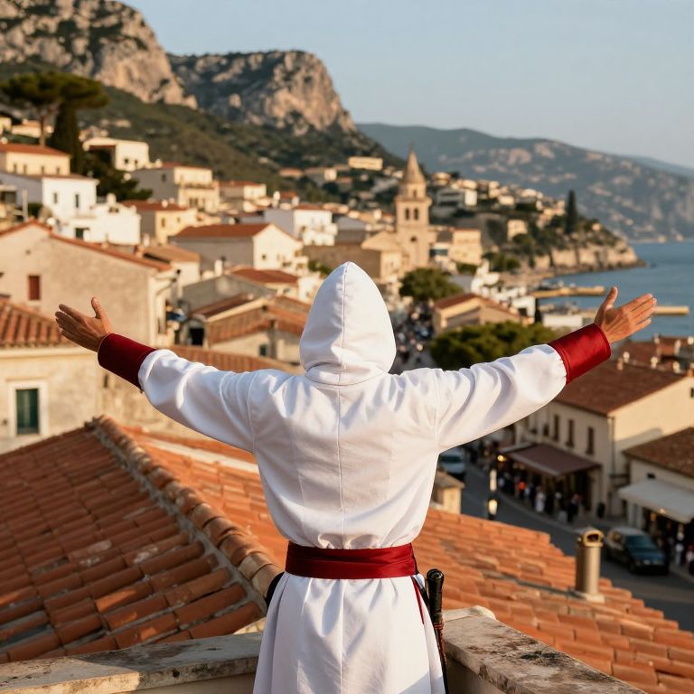 Player overlooking a bustling Mediterranean town from a rooftop, arms outstretched, clad in a white hooded assassin's outfit with red accents, as the sun casts warm hues over terracotta roofs and distant rocky cliffs.
