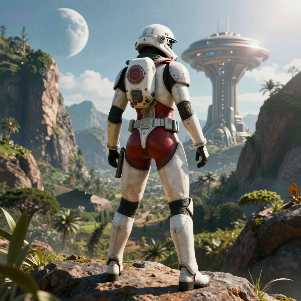 Two-shot, 2women, Highly detailed RAW color Photo, Rear Angle, Full Body, of (two female space soldiers, wearing black and red space suit, helmet, tined face shield, rebreather, accentuated booty), outdoors, (sensually leaning over rocky ledge, looking out at advanced alien structure), toned body, bubble butt, (sci-fi), (mountains:1.1), (lush green vegetation), (two moons in sky:0.8), (highly detailed, hyperdetailed, intricate), (lens flare:0.7), (bloom:0.7), particle effects, raytracing, cinematic lighting, shallow depth of field, photographed on a Sony a9 II, 24mm wide angle lens, sharp focus, cinematic film still from Gravity 2013, ass worship