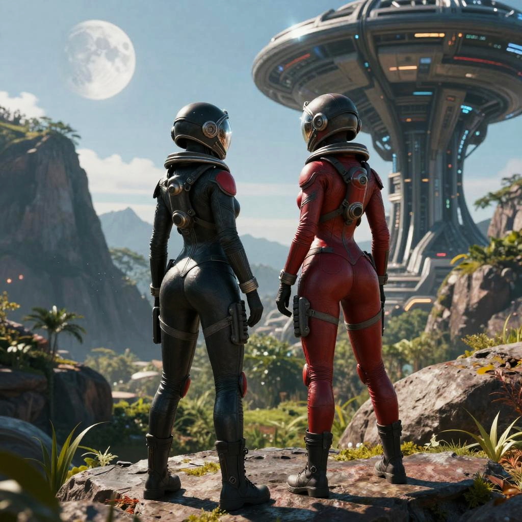 Two female astronauts wearing black and red space suits with helmets and tinted face shields stand on a rocky ledge. They overlook a lush, green landscape with mountains, two moons, and a large advanced alien structure in the background. The scene features cinematic lighting, highly detailed textures, and a sci-fi atmosphere.