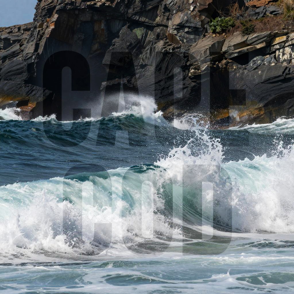 Artistic composition featuring Cape Cod font overlaid on ocean waves crashing against rugged cliffs, dynamic motion with cool blue-green tones and dramatic natural lighting