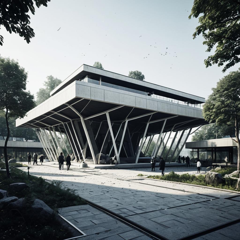 Futuristic and complex deconstructivist pavilion located in an urban zoo, featuring a 470 square meter ground floor area and 7 meter height. The structure is characterized by an intricate architectural design with angular concrete planes and metal framework, surrounded by bare trees in a minimalist urban park setting. A solitary zebra grazes near the pavilion, emphasizing the zoo environment. Visitors can be seen walking around the pavilion, adding scale and liveliness to the scene.