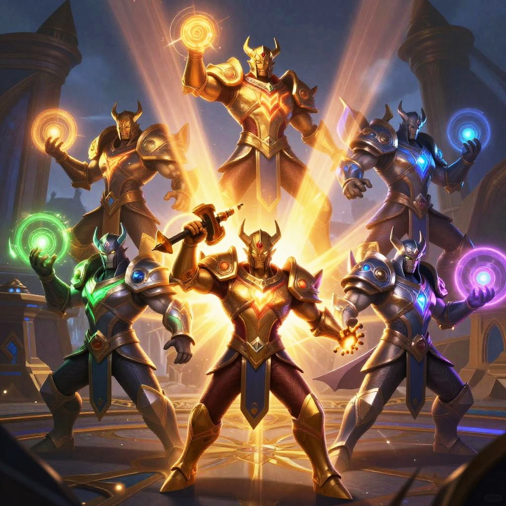 Light league of legends images showcasing glowing champions in epic poses illuminated by radiant energy beams, with detailed armor and mystical background scenery.