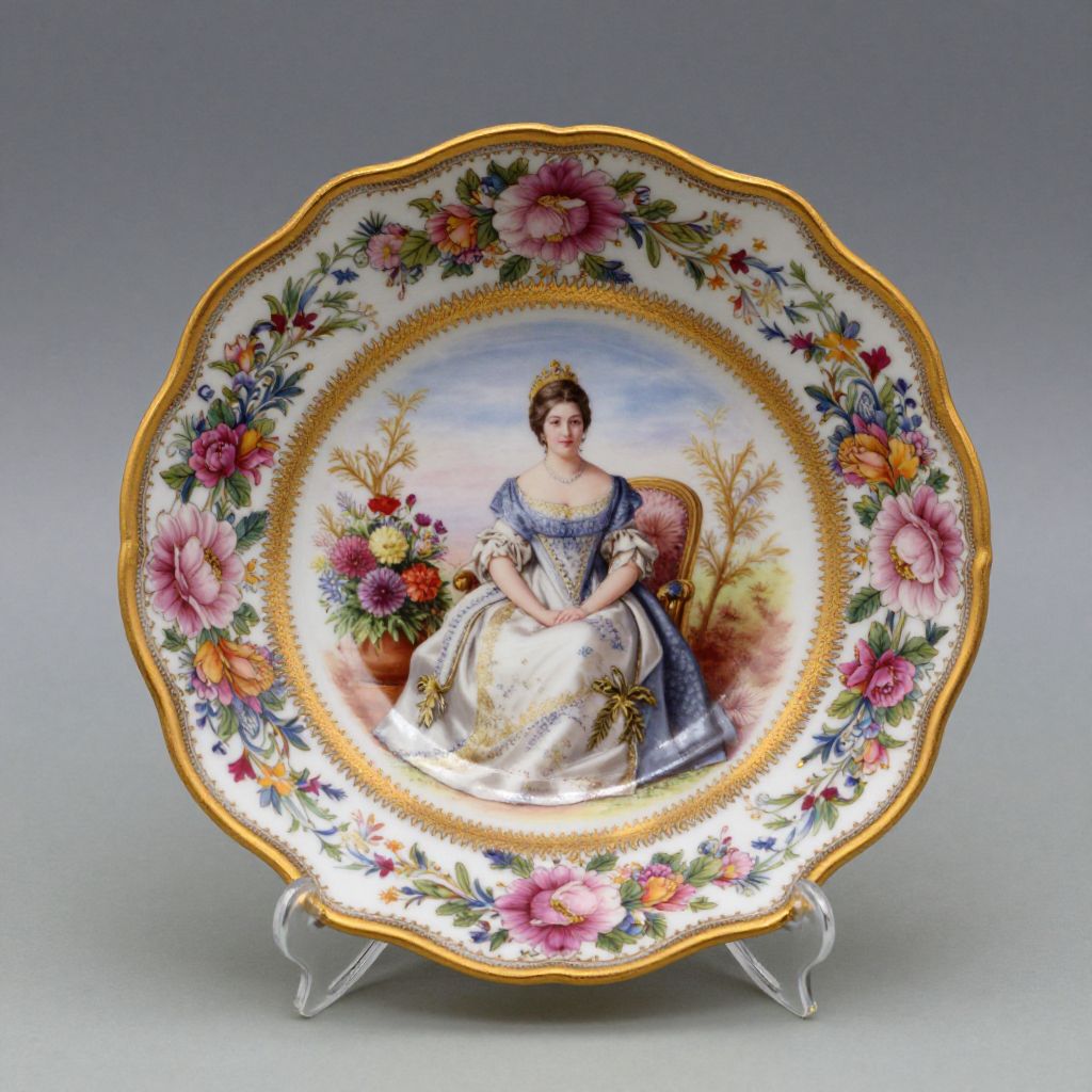 Exquisitely crafted Herend Hungary Porcelain \"Queen Victoria\" bowl featuring a scalloped gold rim, vibrant floral motifs, and a central painted scene of a seated woman in period attire, displayed on a stand against a neutral background.