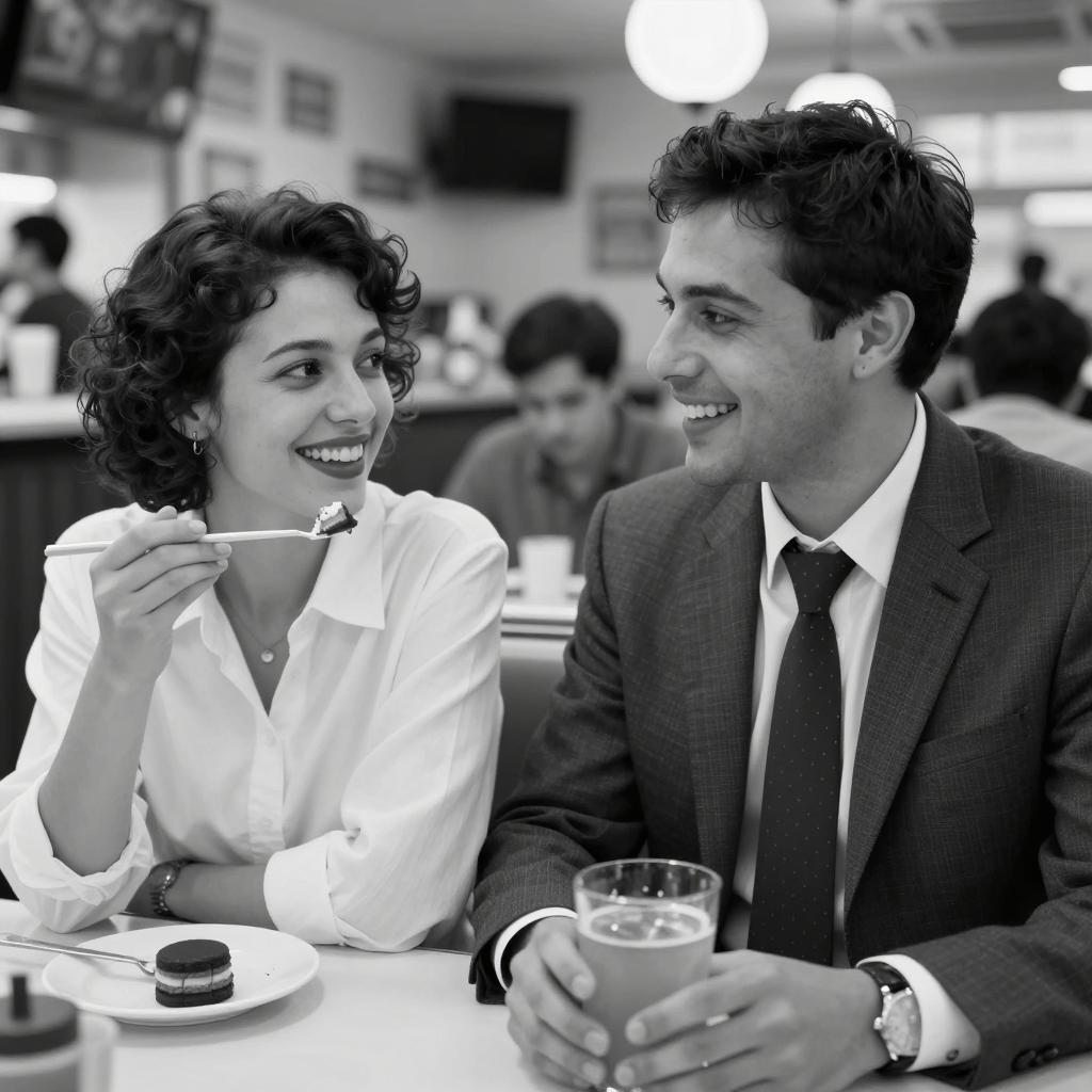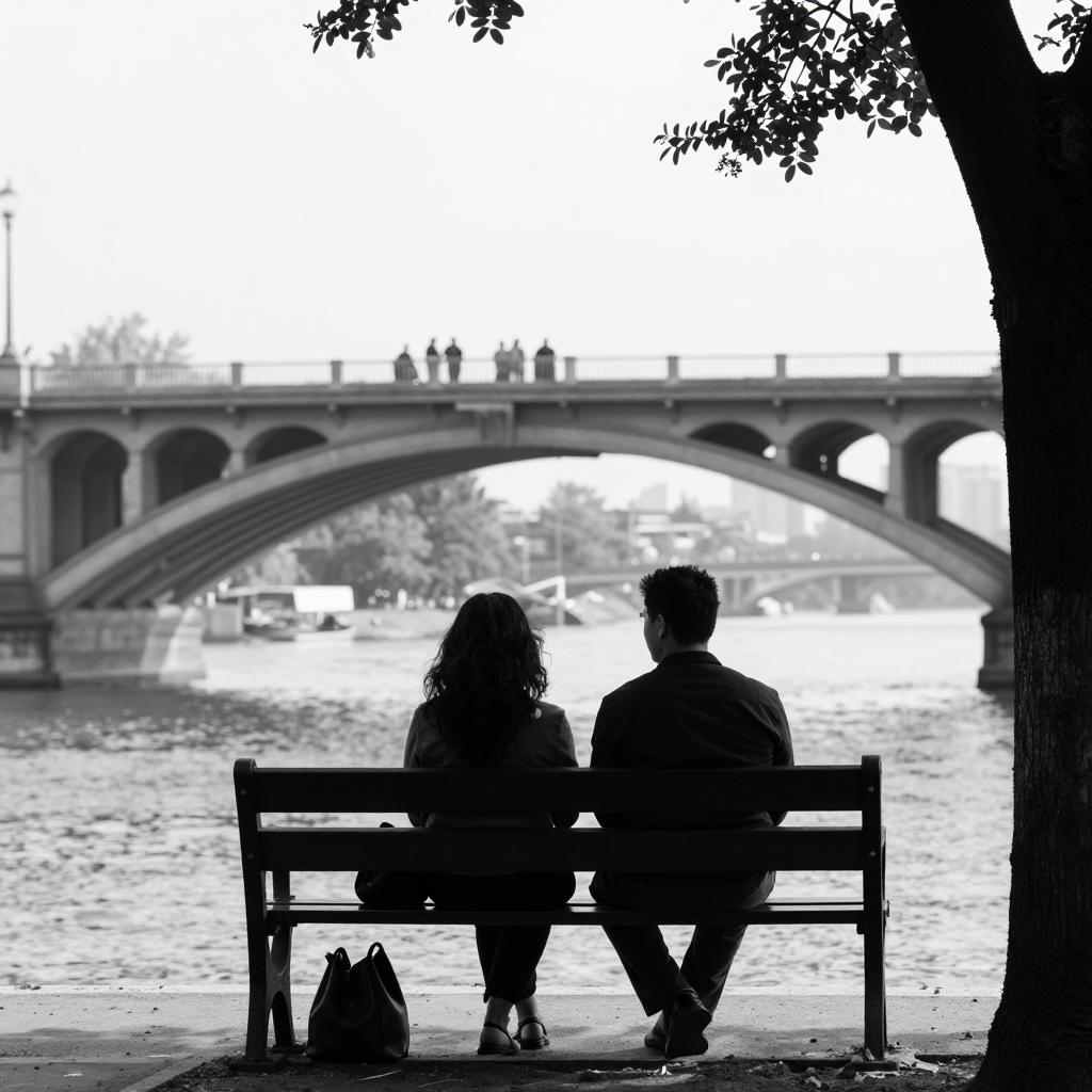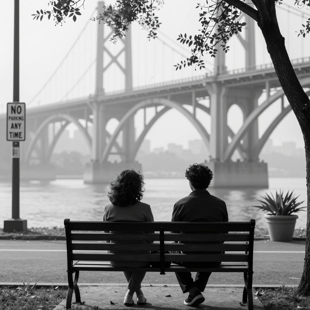 Black-and-white photograph of two people sitting on a bench, back-to-back, under a large bridge. Silhouetted against bright background. No visible facial expressions. Bridge with arches in the background. Street lamp on the left. Tree in the right foreground. Bench in center. One person has curly hair, other has short hair. Bag on the ground near bench.