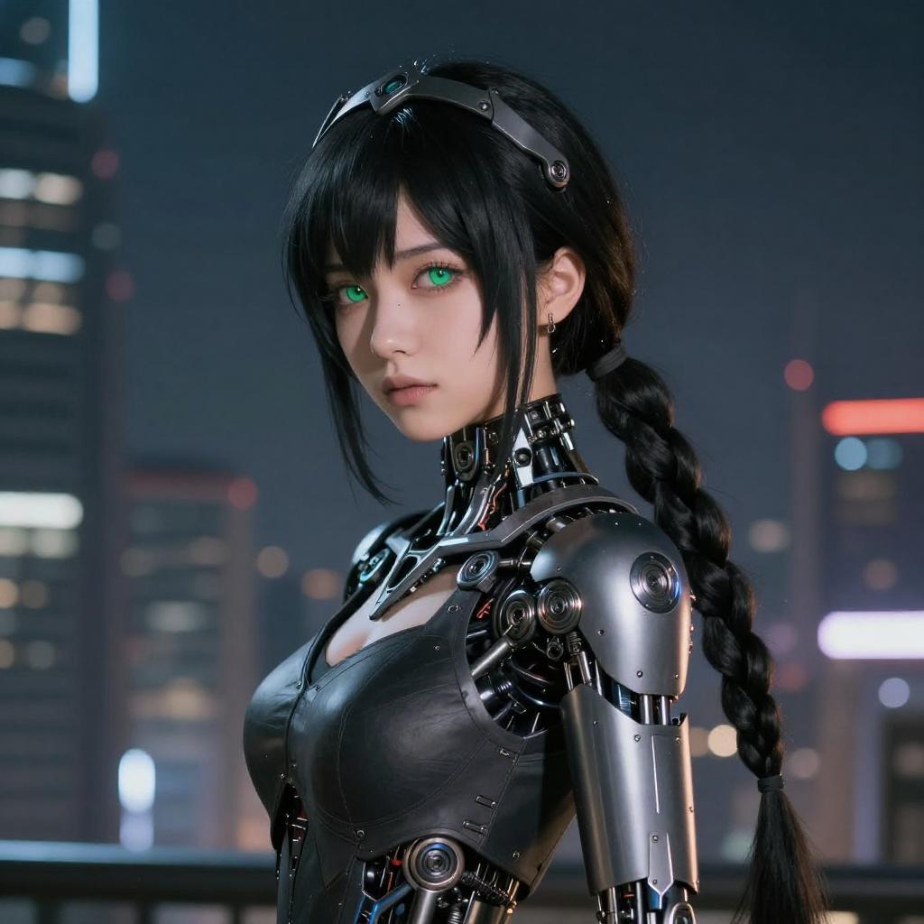 Masterpiece, best quality, 1girl, shadowheart, black hair, braided ponytail, green eyes, circlet, looking at viewer, mechanical arms, cyberpunk city background, night