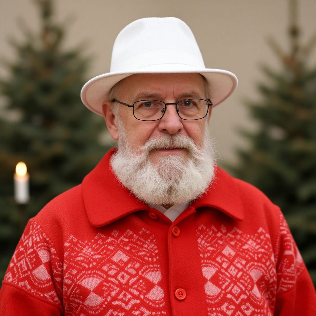 A man with a white beard and a white hat is wearing a red coat with a red and white pattern. He is also wearing a pair of glasses. In the background, there is a Christmas tree and a lit candle.