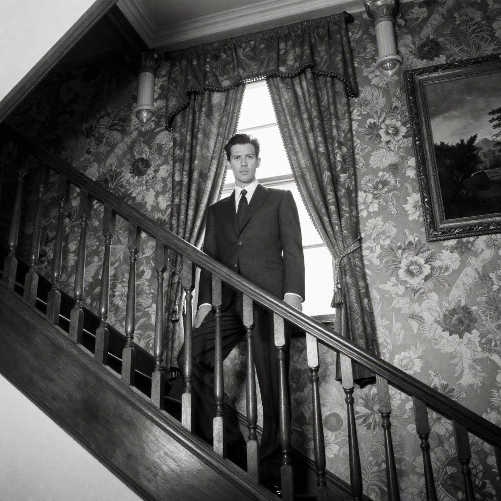 Black and white photograph of a man in a suit standing on a wooden staircase, floral wallpaper, draped window, framed painting, ornate banisters, intense expression, patterned fabric, vintage interior, two columns above staircase.