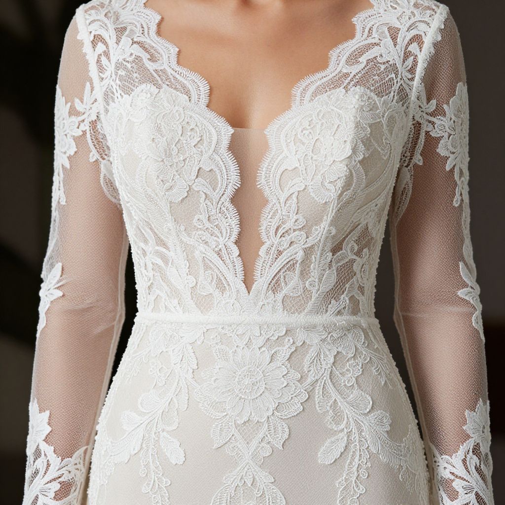 Photograph of a woman wearing a white lace wedding dress with a deep V-neckline. The lace features intricate floral patterns and covers the bodice and long sleeves, which are sheer. The fabric is delicate and transparent, revealing a hint of skin beneath. The background is dark and out of focus, emphasizing the dress. The woman's neck and upper chest are visible, but her face is not shown. The dress has a fitted waist, enhancing an elegant and feminine silhouette. The texture of the lace is detailed and ornate.