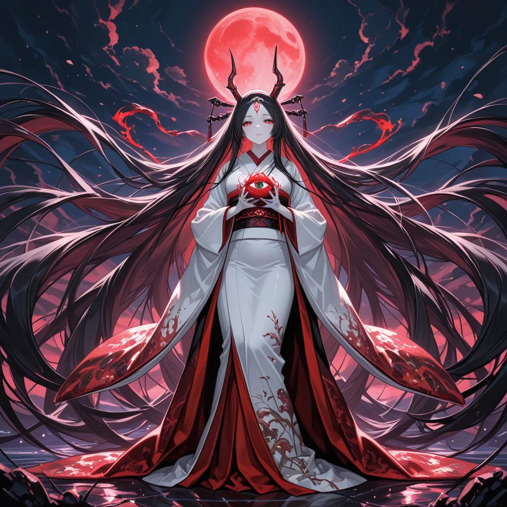 Masterpiece, best quality, highly detailed, ultra-detailed, an extremely delicate and beautiful, 1girl, solo, kaguya, mature female, long hair, absurdly long hair, third eye, horns, pale skin, white short eyebrows, otsutsuki kimono, floating hair, looking at viewer, red moon, night, cloudy sky