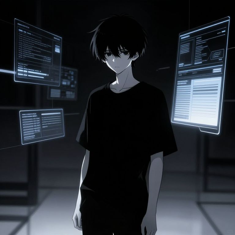 Digital anime drawing of a silent, black-haired boy in a black t-shirt, surrounded by glowing, floating text screens in a dark, futuristic room.