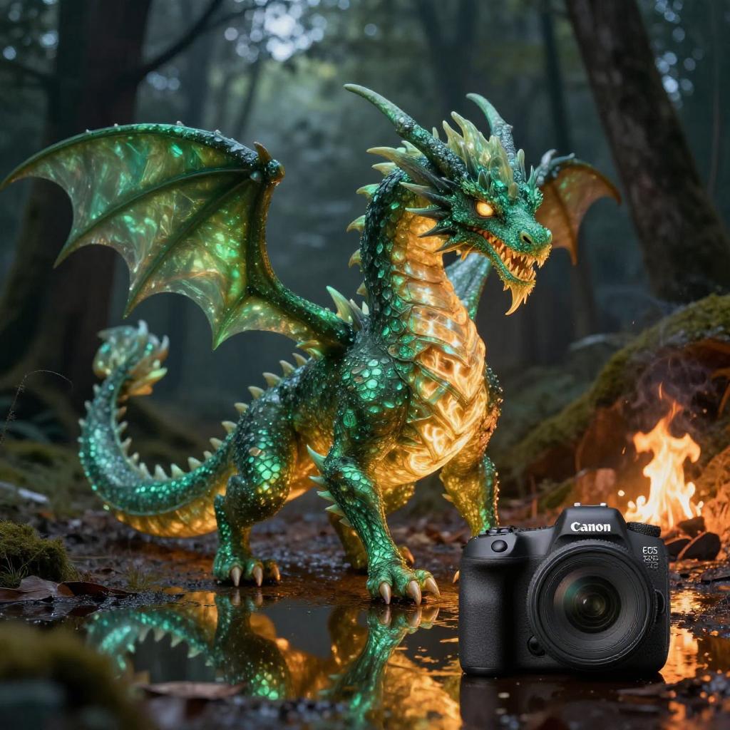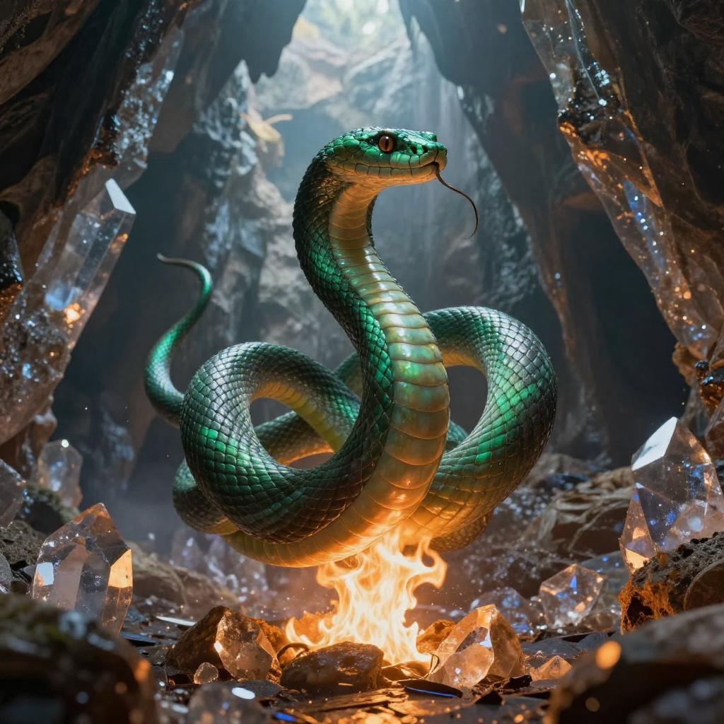 Emerald-green mythic serpent coiled in mid-air glimmers with an inner flame, casting warm reflections across its surroundings within a sunlit crystal cavern. Photo taken by Ansel Adams with a Nikon D850 & 85 mm lens, Award-Winning Photography style, Studio & Fire lighting, 8K Ultra-HD, Super-Resolution.