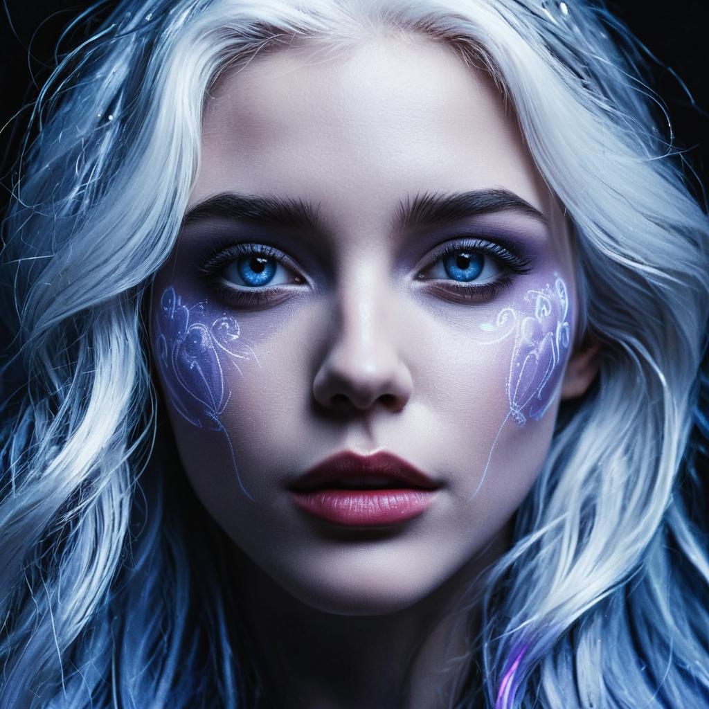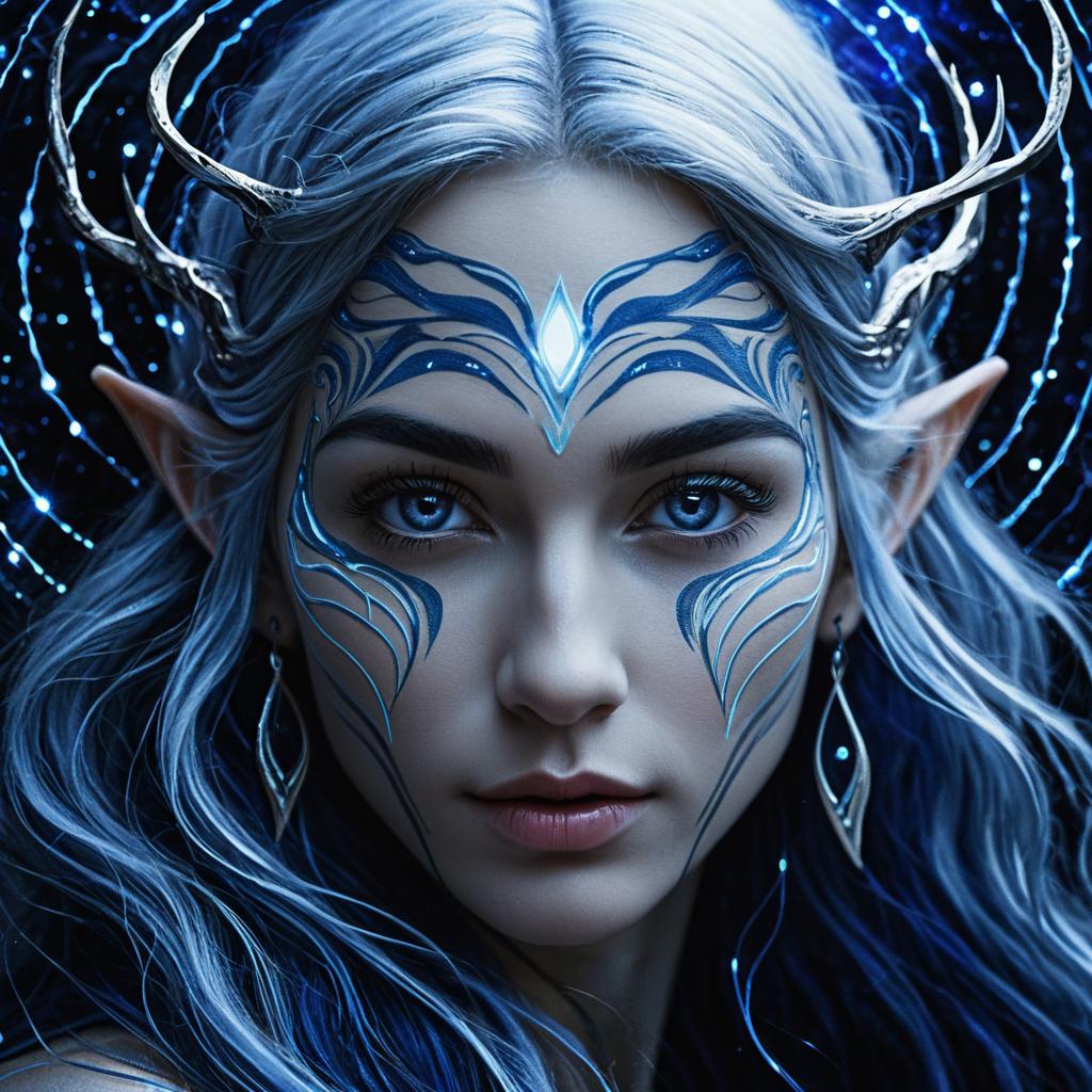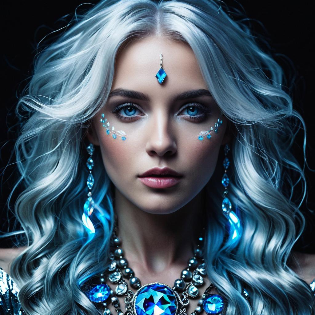 Ethereal oracle with luminous pearlescent swirled skin, cascading iridescent silver hair, piercing crystal blue eyes, shiny skin, hyper-realistic details, vivid colors, dramatic lighting, striking contrast, complex facial features, dynamic pose, mesmerizing atmosphere, high quality, extremely detailed presentation, ethereal beauty, captivating appeal in composition, flaunting unearthly charm.