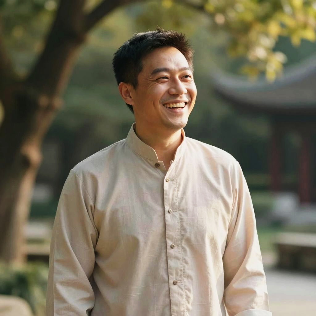 Asian smiling man in traditional attire, standing in a serene garden, warm sunlight filtering through trees, candid joyful moment, high detail photography style