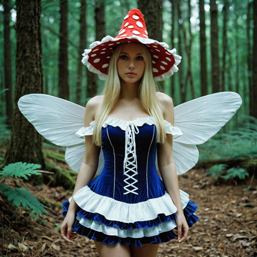 Mushroom fairy costume,1girl, solo, dress, blonde hair, long hair, nature, hat, forest, frills, bare shoulders, realistic, mushroom, frilled dress, lips, wings, looking at viewer