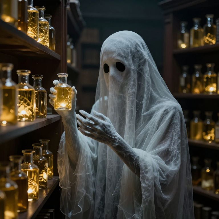 Ghostly figure cloaked in white sits cross-legged between towering bookshelves, intently reading an open book while ethereal mist swirls around, creating an eerie yet focused atmosphere in a dimly lit library.