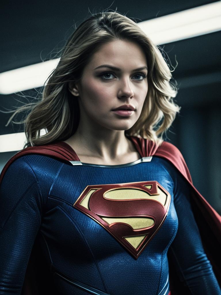 Woman in Supergirl costume, detailed dramatic portrait, photorealistic tones
