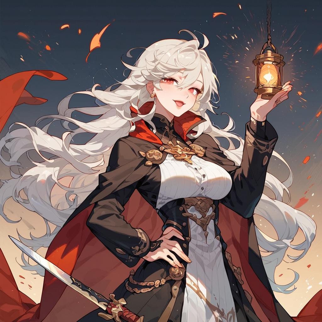 Rating_safe, beautiful, nanashi_mumei, solo, looking at viewer, long hair, very long hair, smile, default_outfit, cape, weapon, knife, dagger, holding lantern, waving at viewer, hand on hip, score_9, score_8_up, score_7_up, score_6_up, score_5_up, score_4_up