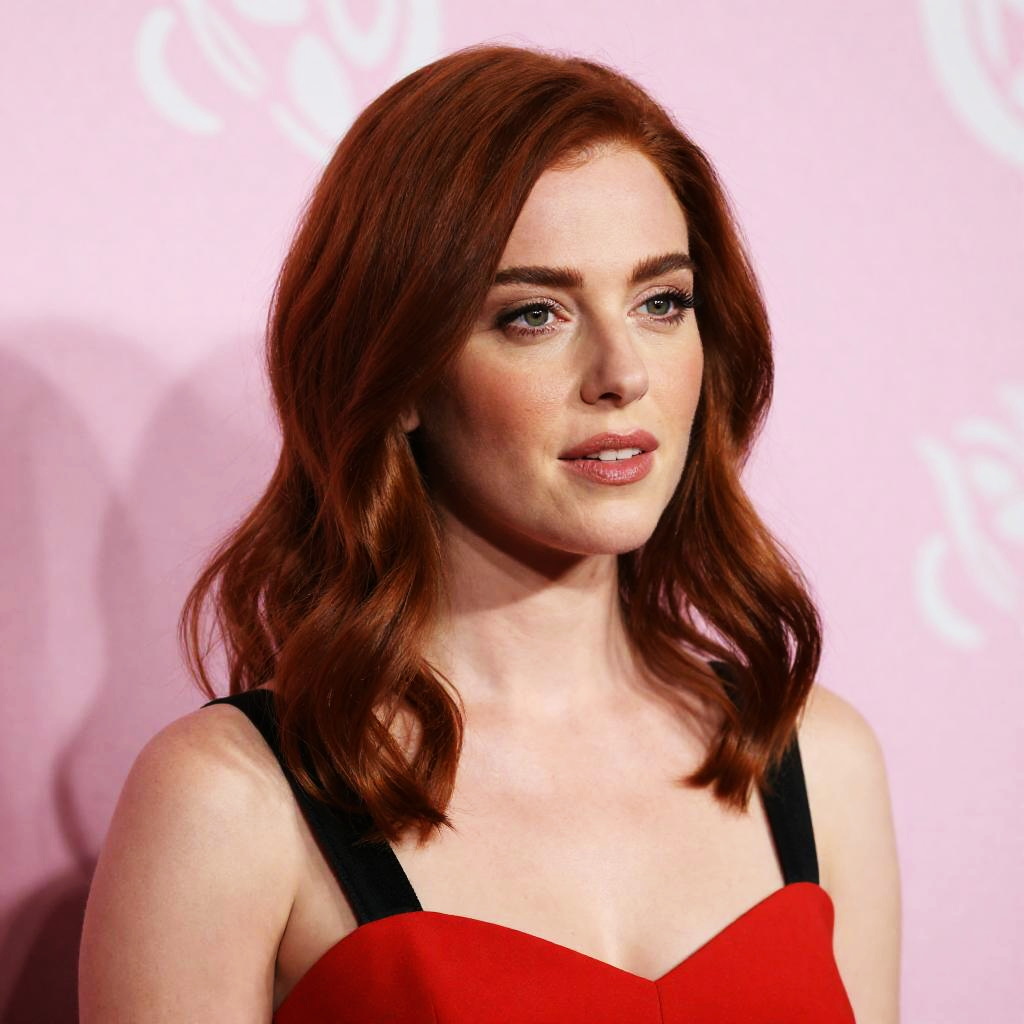 Photograph of a woman with wavy, shoulder-length red-brown hair, wearing a red dress with black straps, looking slightly to the right. Background has a pink, patterned wall. Her expression is neutral, with slightly parted lips. Light highlights her hair and face.