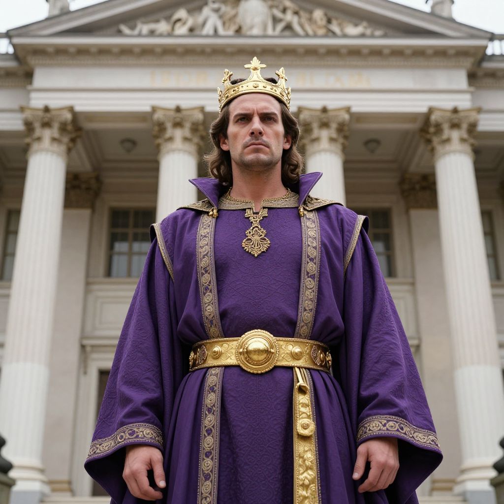 A regal and powerful-looking man with a stern expression, wearing an ornate purple robe cinched with a prominent gold belt, and sporting a magnificent golden crown on his head. He is standing confidently in the foreground, positioned directly in front of a grand, classical building featuring numerous detailed columns.