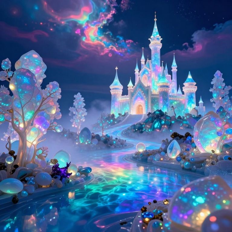 A mystical landscape crafted entirely from glowing opal, shimmering with iridescent hues, The ground, trees, and structures are made of radiant opal, reflecting vibrant blues, purples, pinks, and greens, Each surface glows with a soft, ethereal light, casting shifting rainbows across the scene, In the distance, an opal castle rises from the land, its towers gleaming with multicolored opalescence, while the sky above is filled with glowing clouds that reflect the opal hues below, The atmosphere is dreamlike, with a gentle mist swirling around, amplifying the surreal, otherworldly beauty of this opal world