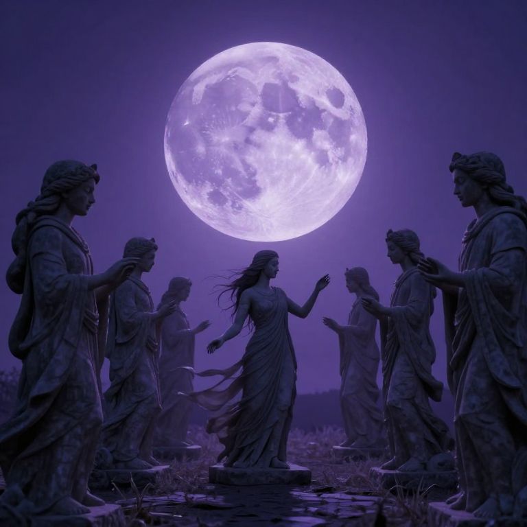 Photograph of six stone statues of classical figures, including two men and four women, silhouetted against a large, luminous full moon in a purple-hued night sky. The statues, with flowing robes and detailed facial features, appear to be dancing or in motion, with one central female statue raising her arm. The moon's bright glow illuminates their textured surfaces, creating a mystical, ethereal atmosphere. The ground is slightly visible with patches of grass and small stones, adding to the natural setting. The image's overall tone is otherworldly and dreamlike.
