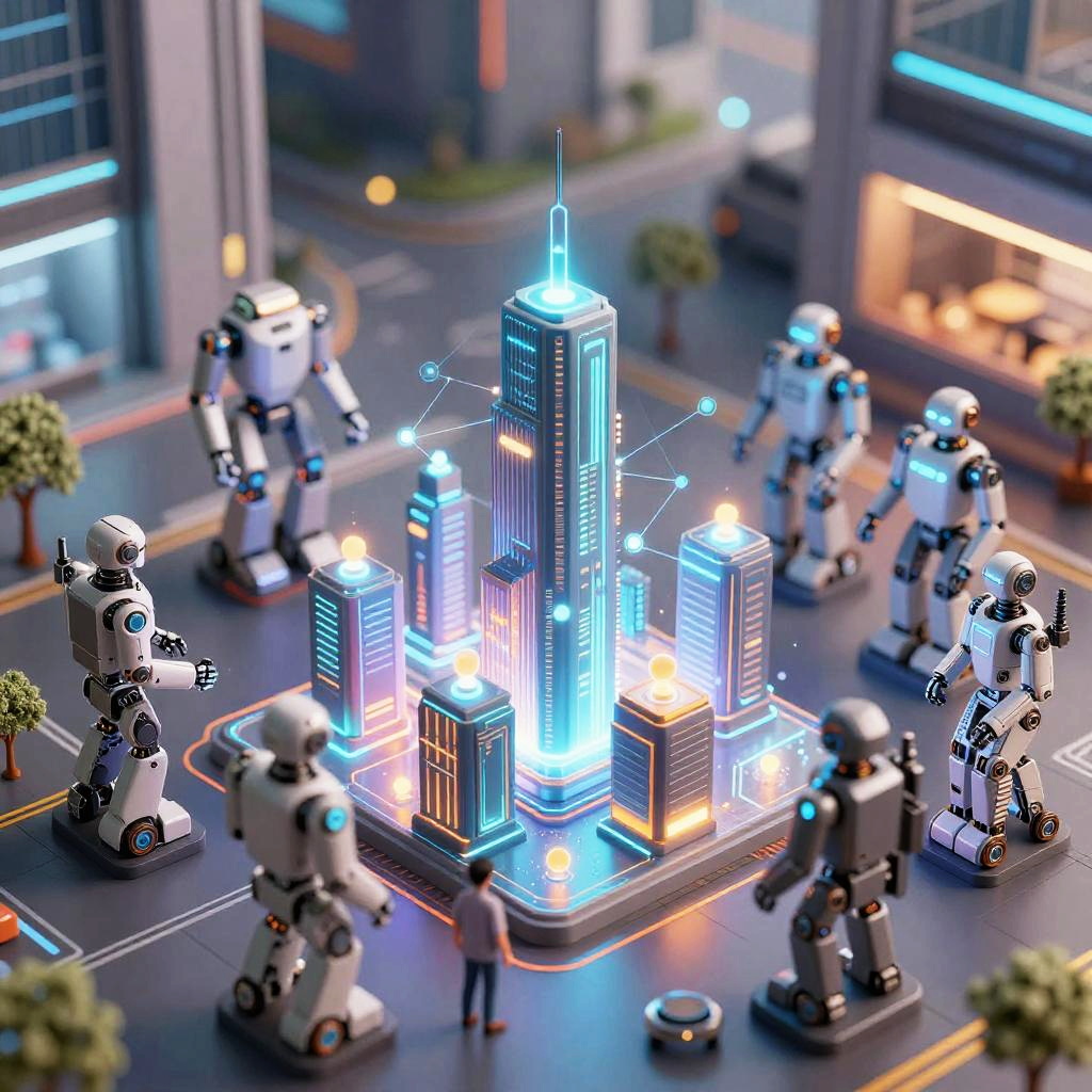 Plan AI development, dynamic scene of AI-driven machines collaboratively building an intelligent smart city, glowing data points and network connections, high-tech robotic architecture, modern futuristic environment, vibrant color palette, detailed digital rendering