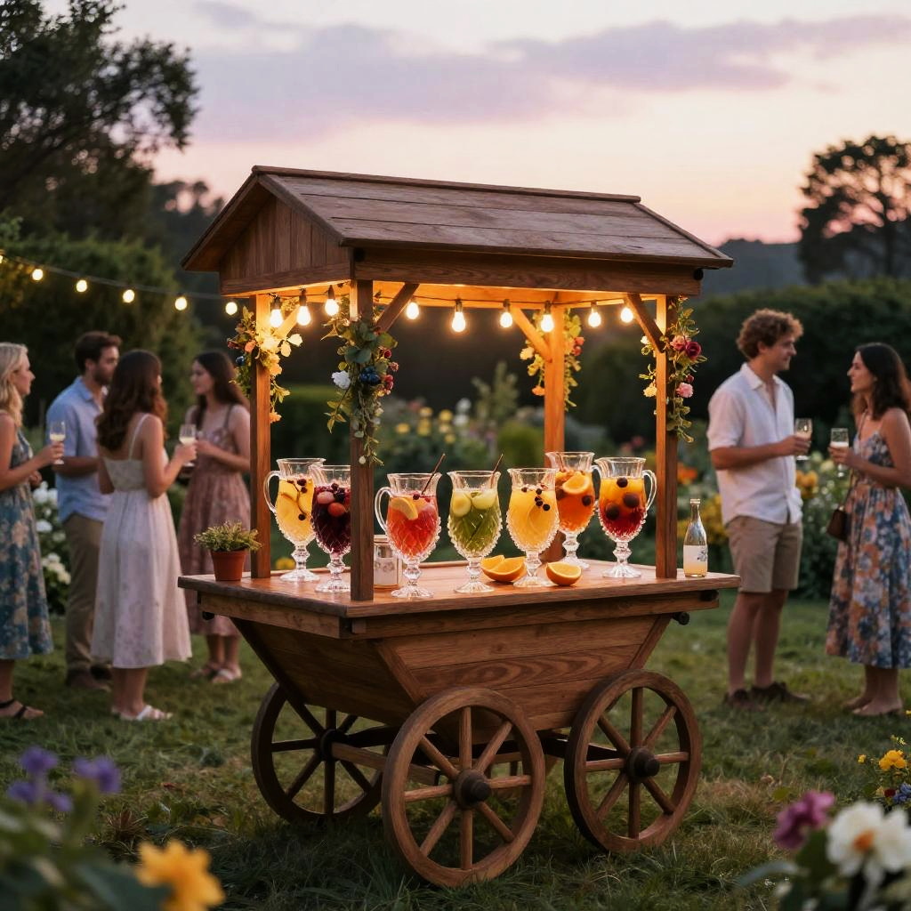 The sangria stand in a quaint village square during a festive celebration, decorated with fresh flowers and fruit garlands, barrels of fruity sangria on display, joyful people dressed in festive attire, cobblestone streets and historic buildings surrounding
