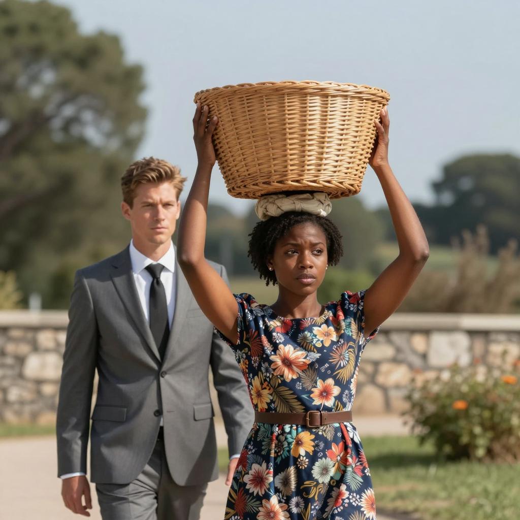 A white man in a gray suit and black tie standing beside a Black woman with dark skin. She wears a floral dress and carries a large wicker basket on her head. Background includes a stone wall, greenery, and tall trees under a clear blue sky. The man has short brown hair and a neutral expression. The woman has a focused expression and raises her arms to balance the basket. The image is outdoors in daylight.