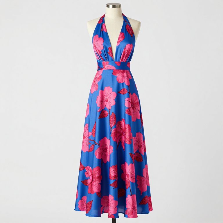Photograph of a sleeveless, blue halter dress with a deep V-neck and vibrant pink floral patterns, displayed on a mannequin.