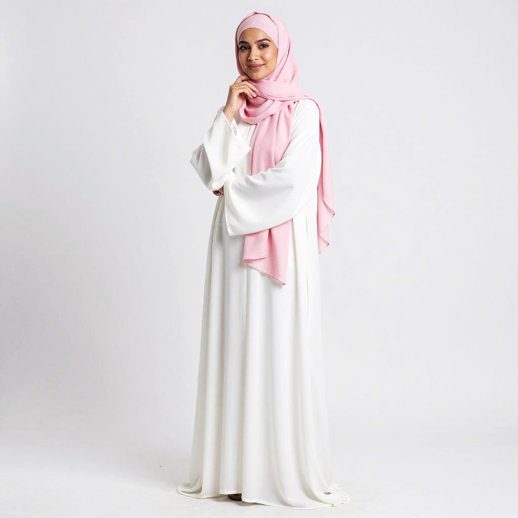 Photograph of a young woman standing against a plain white background. She's wearing a long, white, flowing abaya with a light pink hijab that matches her pink scarf. Her head is slightly tilted, and she's looking at the camera with a gentle smile. She has a light brown skin tone and is standing with one hand near her chin. The overall style is elegant and modest.